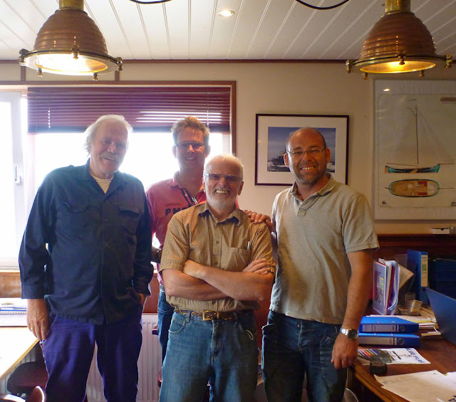 On Wednesday morning, the 19th of June, with our seven-month refit in Harlingen complete, we went up to the office of Scheepsbouw & Reparatie Friesland to bid our farewells. We had the rare good luck of finding the three partners, Lex Tichelaar, Wychard Raadsveld and Klaas Koolhof in the office at the same time. After we had thanked them for the wonderful work they had orchestrated, I posed for a photo with them. I am not a short person, but with the Dutch having the tallest average height in the world, these three men at 195 to 200 centimetres tall towered over me. Their work seems to tower over that of other yards in our experience.