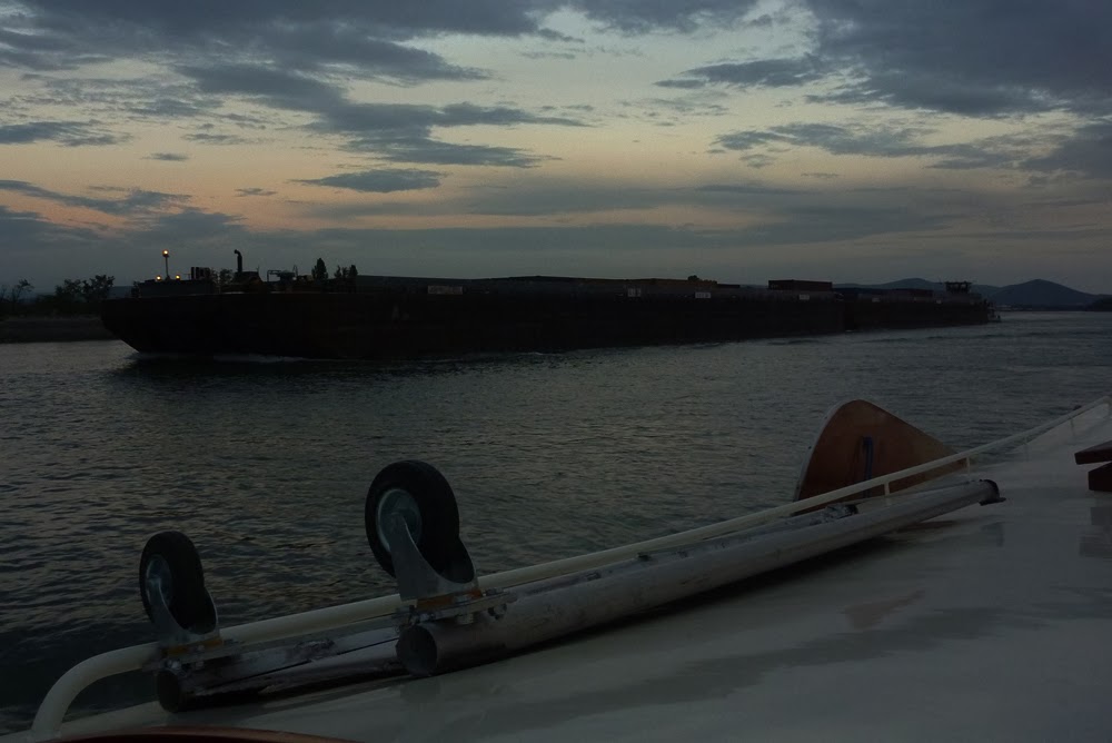 In the fading light we met a lock-filling barge on its way up river. We crept along the final half kilometre to the lock, using primarily the iPad to help pick out shapes around us. Most of the locks we had been in thus far on the Rhône have had a similar layout in their upstream approaches, so we knew what to look for. We found the pleasure boat float, but plunked exactly in its centre was a boat of about nine metres length. There was nobody aboard, and not wanting the liability of moving the boat along so we could share the float with it, at 1958, after adjusting our fenders, we rafted onto it and shut down for the day. We had come 88.5 kilometres and had passed through another four locks.